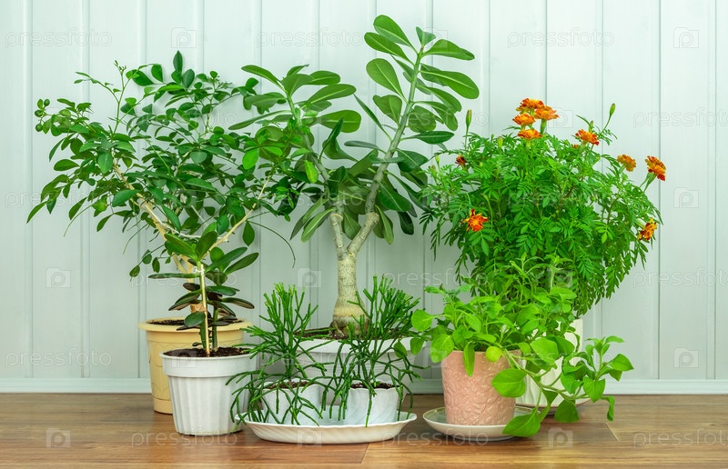 Комнатные растения в цветочных горшках на деревянном полу на синем фоне