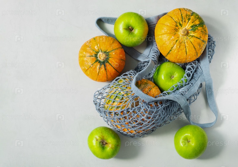 Маленькие спелые тыквы и зеленые яблоки в экологической авоське