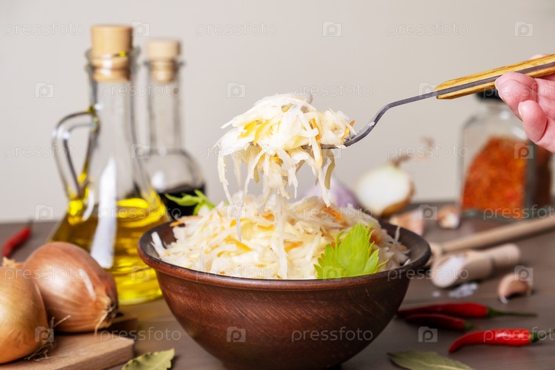 Ферментированная капуста в керамической миске на столе со специями и ингредиентами