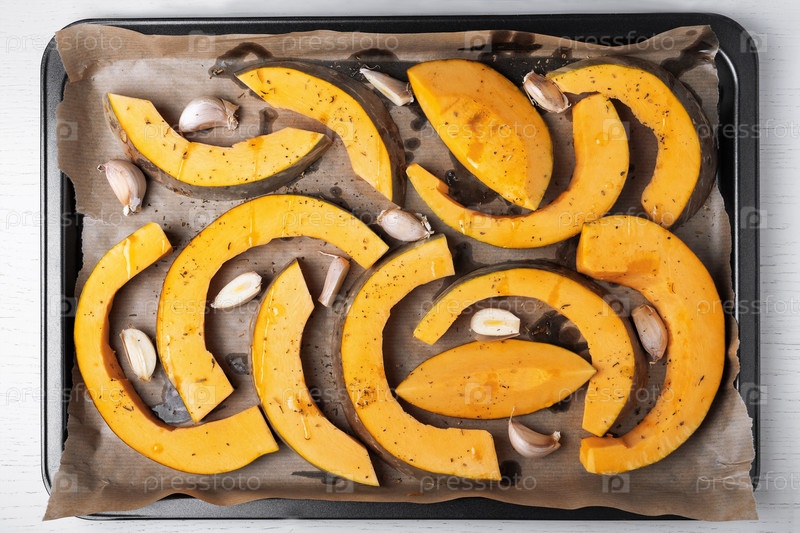 Кусочки тыквы раскладывают на пергаментной бумаге на противне