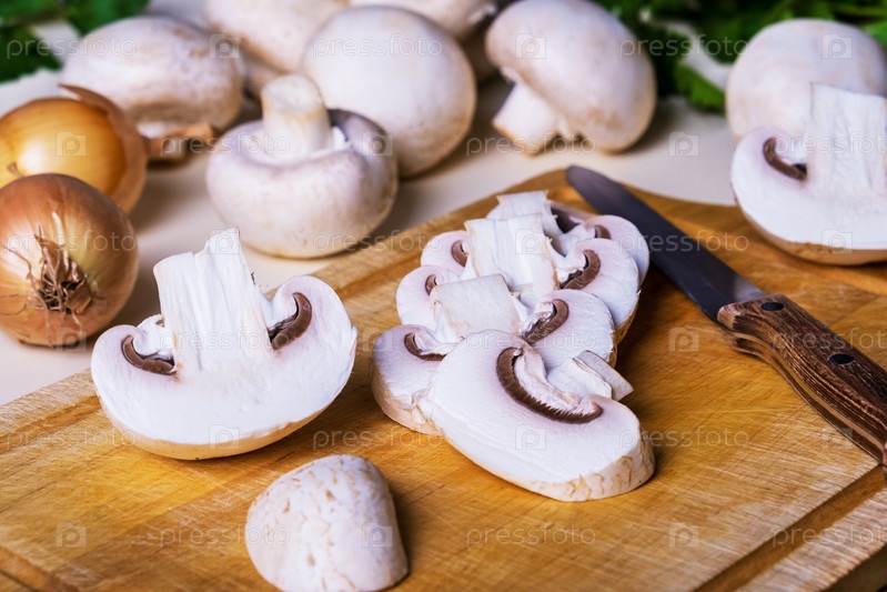 Нарезала шампиньоны ножом на разделочной доске. Готовить на кухне