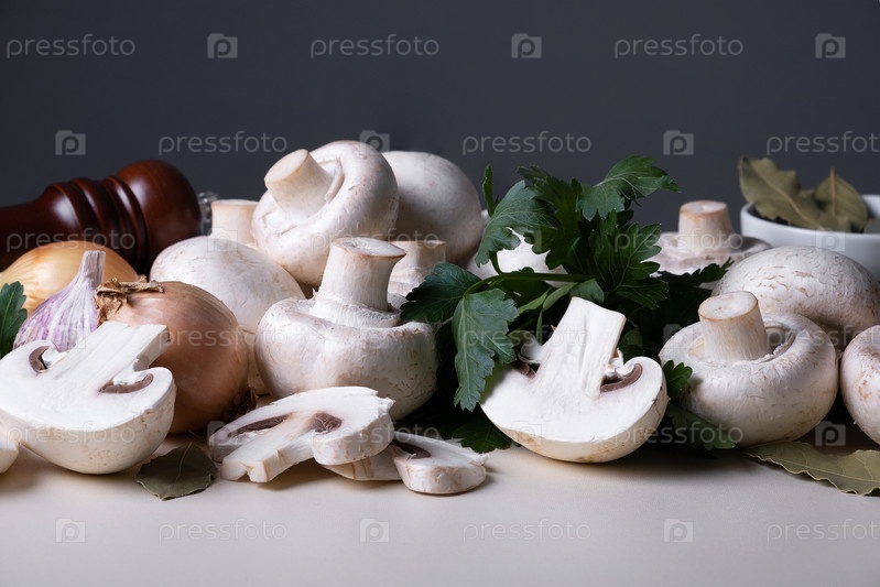 Куча целых сырых свежих шампиньонов с другими кулинарными ингредиентами на столе