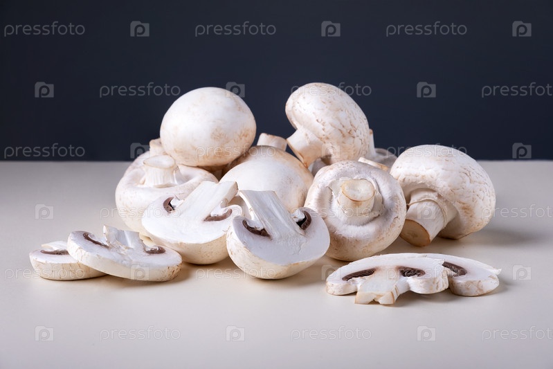 Целые и нарезанные шампиньоны выложены на светлой поверхности на темном фоне
