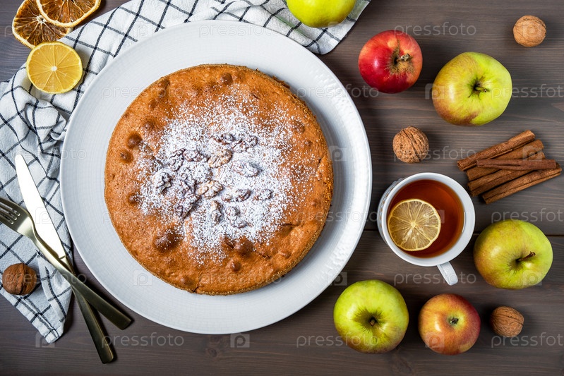 Домашний яблочный пирог в окружении свежих спелых яблок