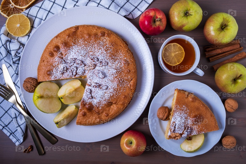 Нарезанный яблочный пирог с грецкими орехами и спелыми яблоками