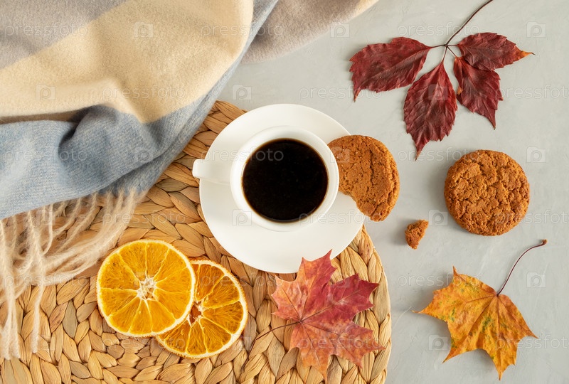 Чашка черного кофе на сером фоне с осенними листьями, теплая накидка, плетеная салфетка, овсяное печенье и ломтики сушеных апельсинов