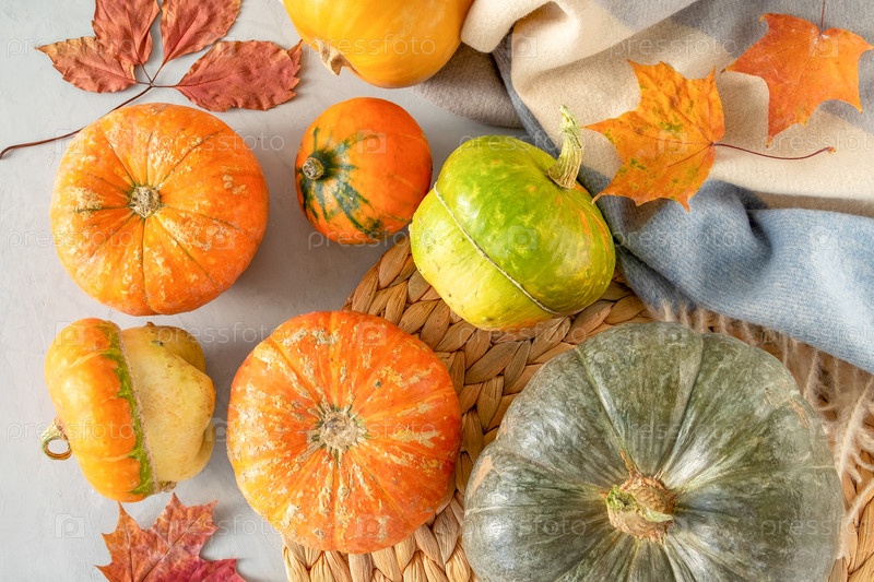 Плоская планировка красивых маленьких тыкв на сером фоне с теплым одеялом и плетеной салфеткой из ротанга