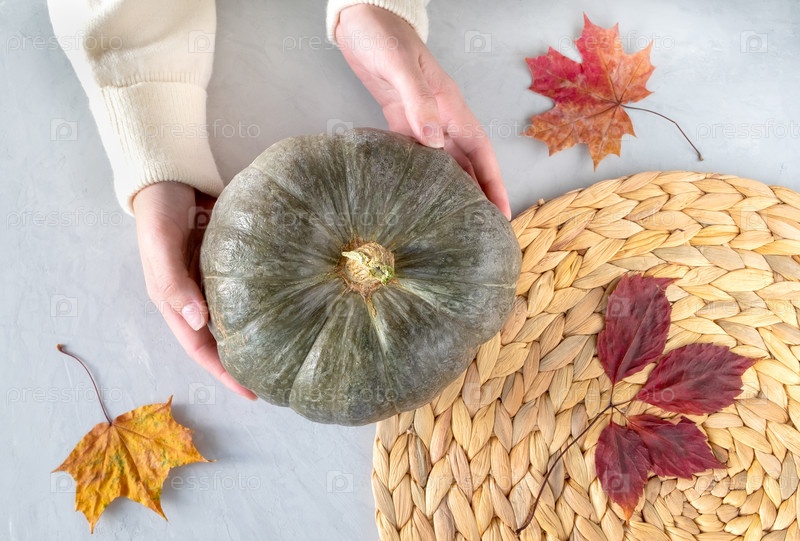 Женские руки держат красивую тыкву на серой поверхности с сухими осенними листьями и плетеной салфеткой