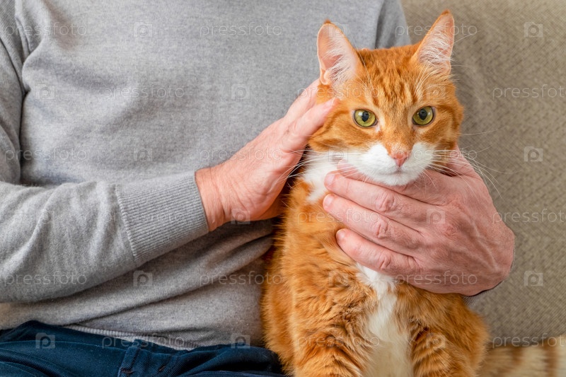 Взрослый крупный рыжий кот сидит на диване рядом со своим хозяином, взрослым мужчиной