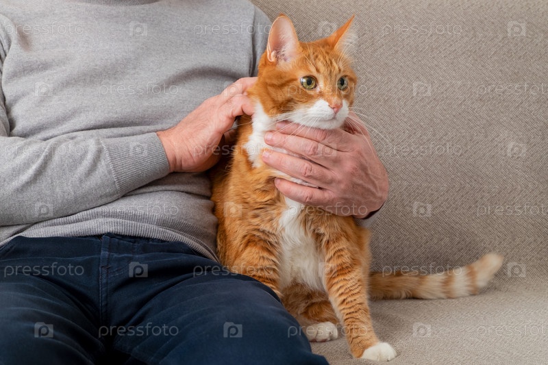 Взрослый крупный рыжий кот сидит на диване рядом со своим хозяином, взрослым мужчиной
