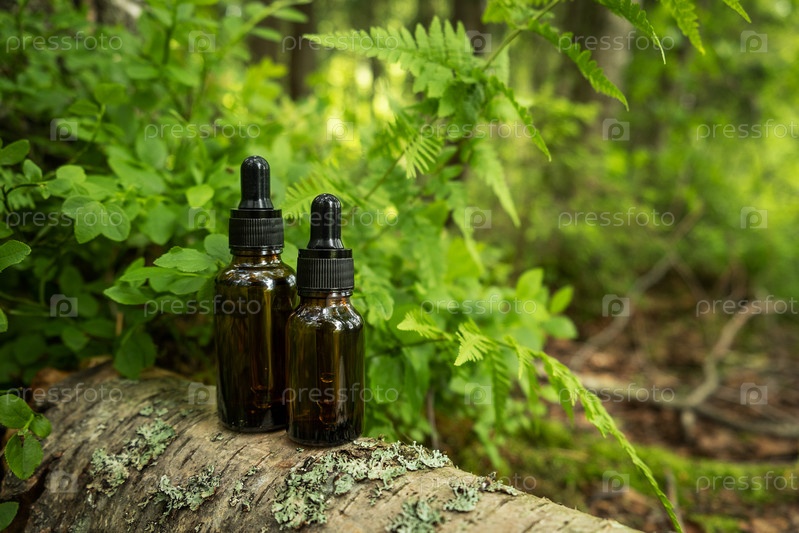 Два стеклянных косметических контейнера размещены на фоне естественного леса