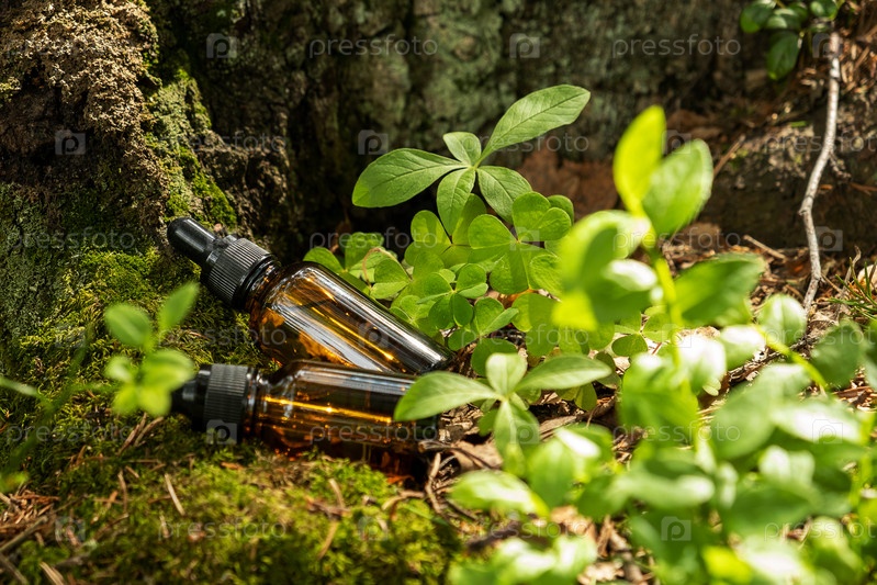 Косметические контейнеры с пипеткой расположены на фоне естественного леса