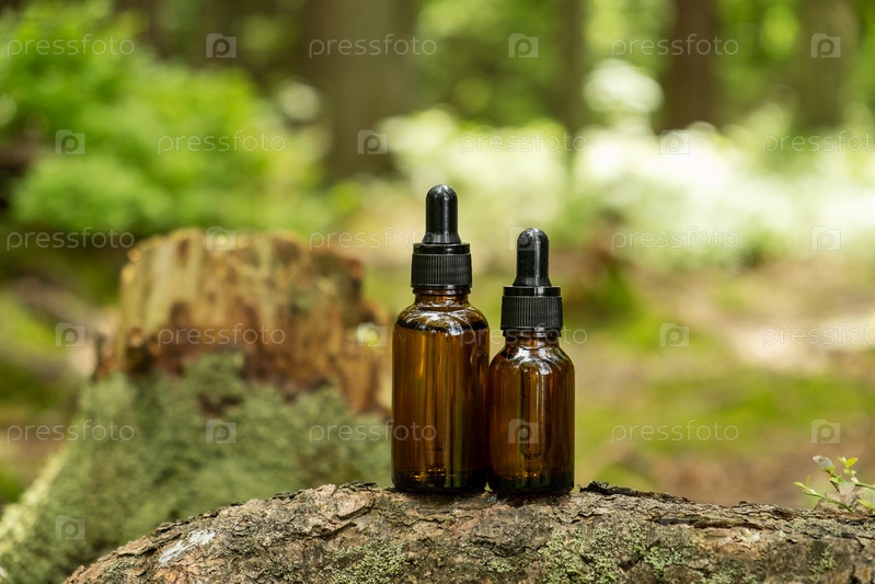 Косметические контейнеры с пипеткой расположены на фоне естественного леса