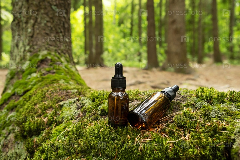 Косметические контейнеры с пипеткой расположены на фоне естественного леса