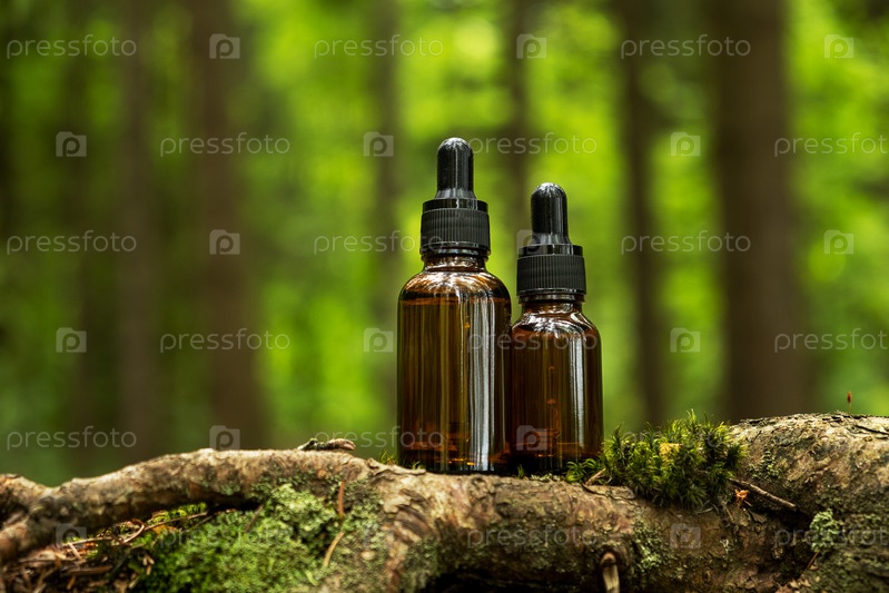 Косметические контейнеры с пипеткой расположены на фоне естественного леса