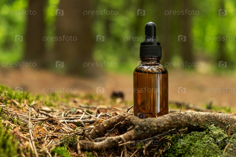 Косметические контейнеры с пипеткой расположены на фоне естественного леса