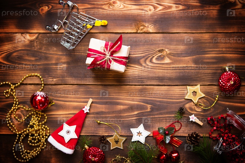 Рождественская квартира лежала на тему покупок, тележки с подарочной коробкой. Покупка подарков к Новому году. Черная пятница, распродажа, декор из звезд, мяч, бусы, гирлянды на деревянном фоне. Место для текста