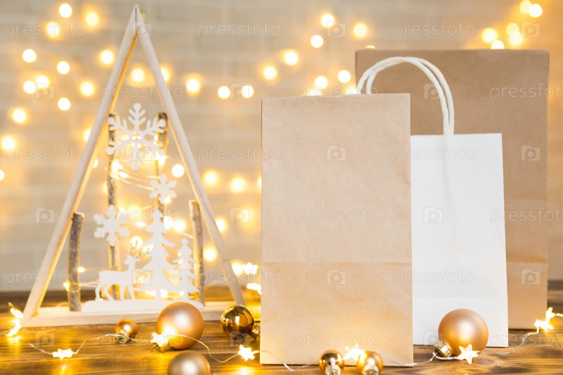 Рождественский декор службы доставки еды одноразовый пакет из крафт-бумаги. Готовый заказ, экологически чистая перерабатываемая упаковка, ноль отходов. Праздничное питание, приготовление сладостей домашнего приготовления. макет, тег