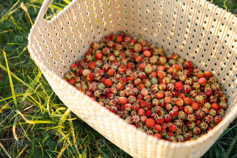 Свежие спелые красные ягоды дикой лесной клубники в корзине за травой. Дары природы, витамины лета, сбор ягод, урожай