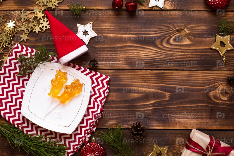 Два леденца на палочке в форме символа нового 2021 года - бык на белом блюдце, полотенце с орнаментом и рождественский декор на деревянном фоне. Ювелирные звезды, бусы, шар, ель. Плоская планировка, пространство для копирования