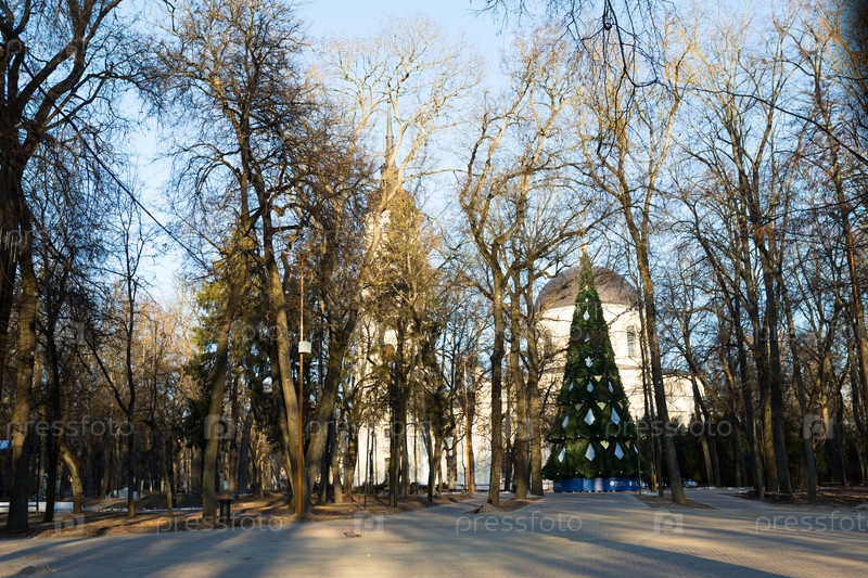 Калуга, Россия-7 декабря 2020 г. Подготовка к празднику. Город является новогодней столицей России. Елка, украшение аттракционов-старый торг, парк, сквер