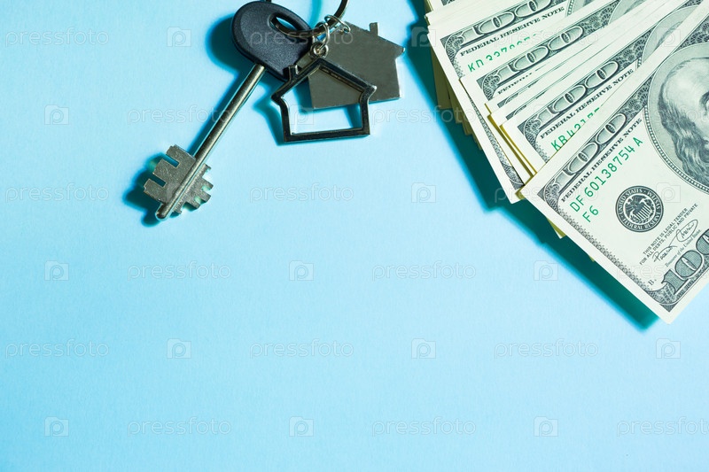 Ключ от дома с брелком на стопке 100-долларовых купюр на синем фоне. Покупка квартиры, дома, недвижимости, бизнеса, ипотека и жилищный кредит в банке, сбережения, наличные, переезд. Копировать пространство