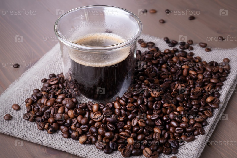 Стеклянная чашка с кофе и кучей зажаренных в духовке кофейных зерен