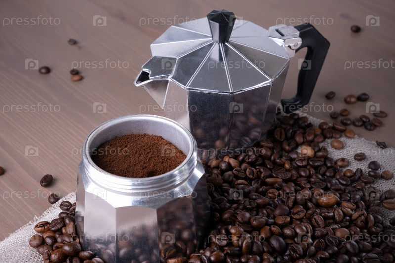 Разобранная гейзерная кофеварка на деревянной поверхности. Кофейные зерна