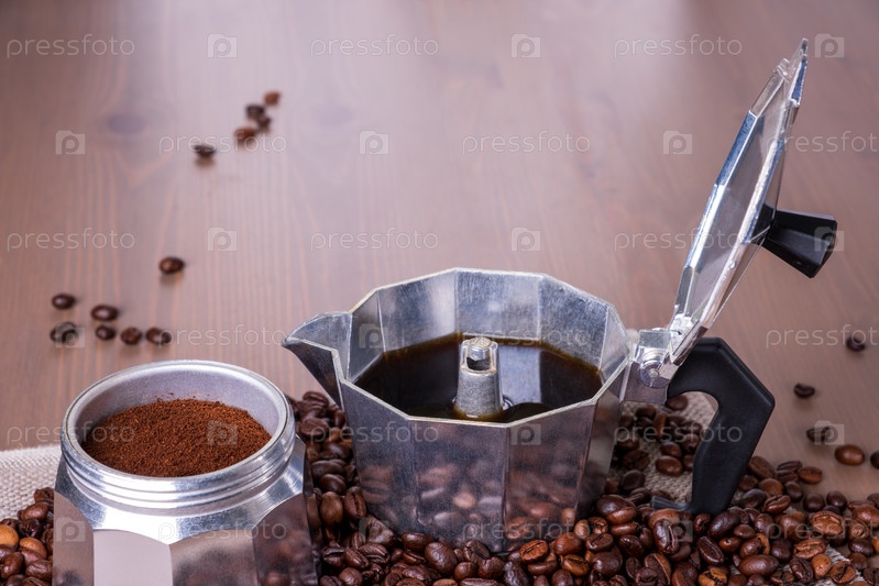 Разобранная гейзерная кофеварка на деревянной поверхности. Кофейные зерна