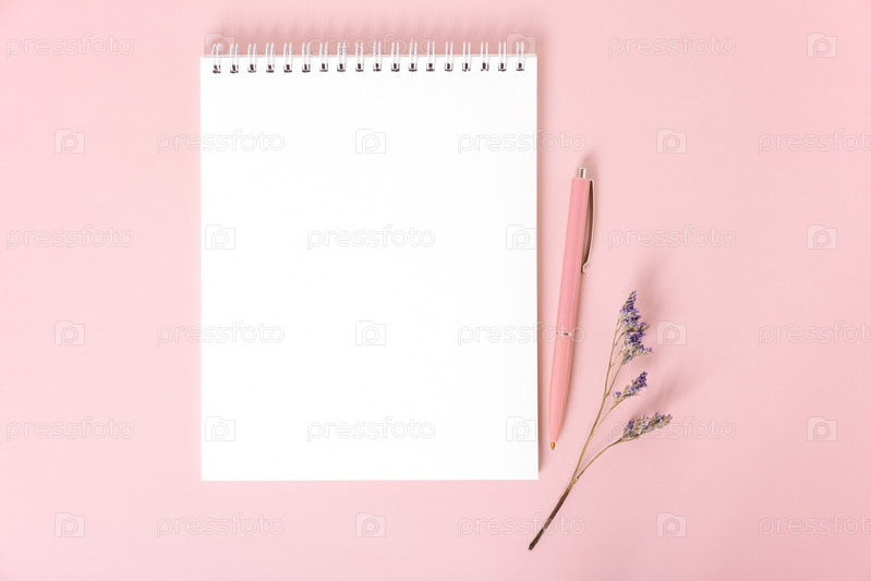 Блокнот с белыми чистыми листами, розовой ручкой и сушеной веточкой цветка