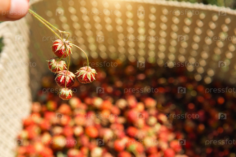 Свежие спелые красные ягоды дикой лесной клубники в корзине за травой. Дары природы, витамины лета, сбор ягод, урожай