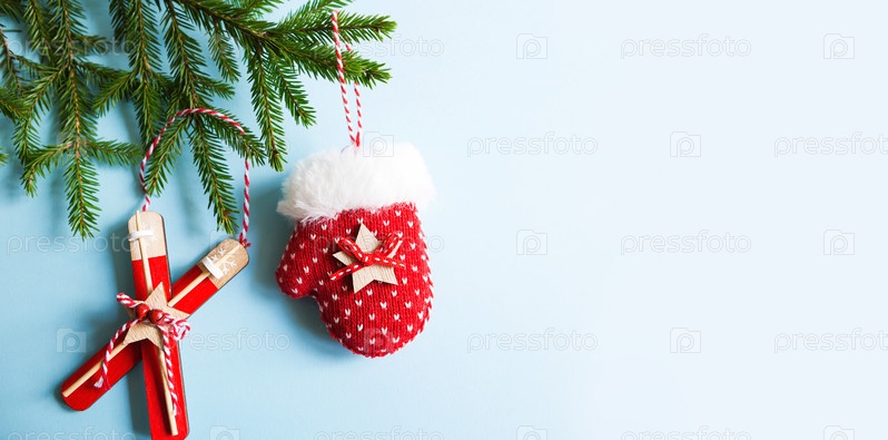 Рождественский макет зимних видов спорта с еловой веткой. Игрушки лыжи, варежки, синий фон. Новый год, елка, зимние развлечения. Рамка. Копировать пространство