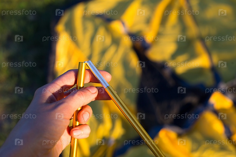 Алюминиевые монтажные дуги для установки туристической желтой палатки в руке крупным планом. Легкое снаряжение для туризма. Активный отдых, инструкции по сборке, внутренний экотуризм. Копировать пространство