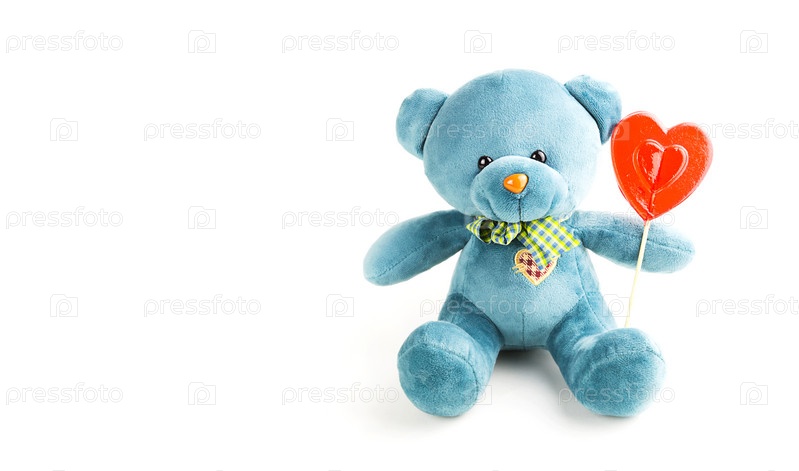 Бирюзовый мягкий плюшевый мишка с красным сердцем леденца на палочке на белом фоне. Любовь, подарок девушке, признание в любви, день святого Валентина. Копировать пространство