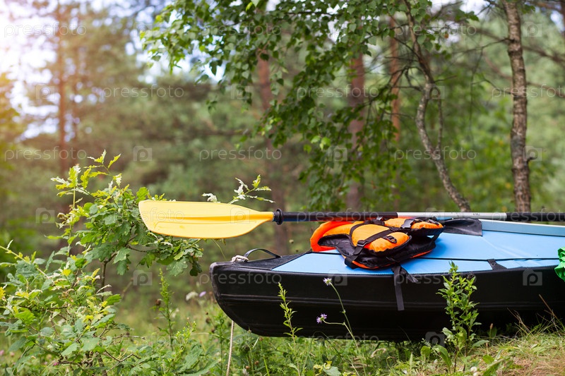 Туристический катер на берегу. Спортивное водное путешествие на байдарках, гребле и рафтинге. Внутренний туризм, экотуризм