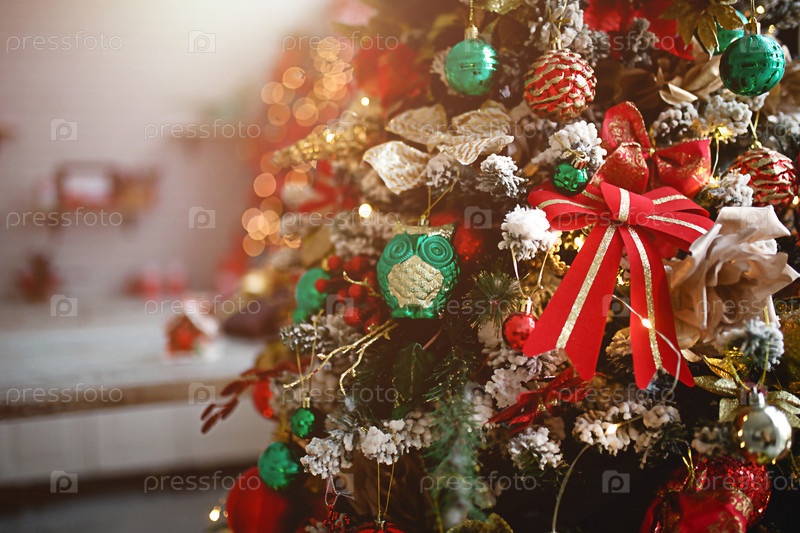 Рождественский декор искусственная елка крупным планом. Красные и зеленые игрушки, ленточки, стеклянная сова, снег. Огни гирлянды в коробке. Новогодний фон