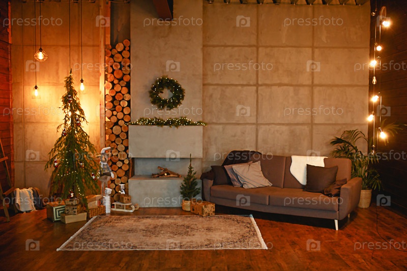 Новогодний интерьер в стиле скандинавского лофта: серый бетон, деревянный декор, лампы накаливания, реалистичная искусственная елка. Уютный Новый год в загородном доме