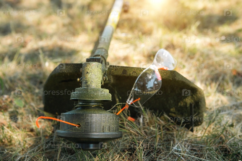 Триммер после скашивания травы крупным планом. Бензонасос на траве в защитных очках. Ландшафтный дизайн и благоустройство садового участка, уход за газоном