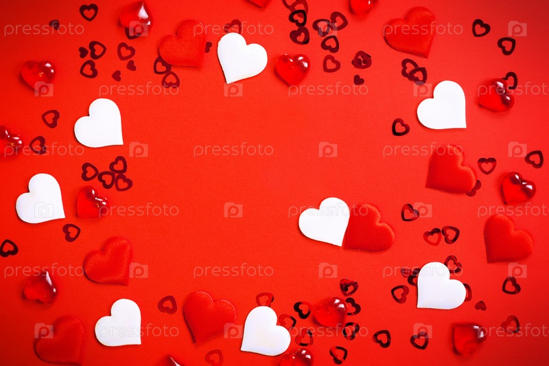 Текст или фоторамка в центре, окруженная сердечками. Декор влюбленных пар с сердечками на красном фоне. День святого Валентина, сообщение, приветствие, признание в любви. Копировать пространство