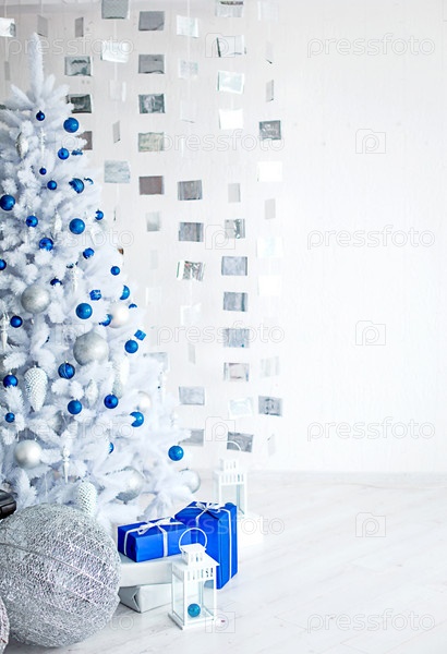 Белая искусственная новогодняя елка в светло-серой комнате украшена голубыми и серебряными шарами. Коробки с подарками, украшения из кубиков на стене. Новый год. Место для текста, холодный фон
