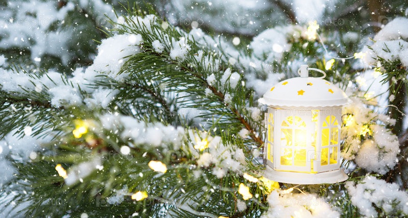 Рождественский фонарь с окнами на ветке натуральной ели в снегу. Новый год на открытом воздухе. Снегопад, гирлянды, праздничное настроение сказок и волшебства, убранство улиц. Копировать пространство