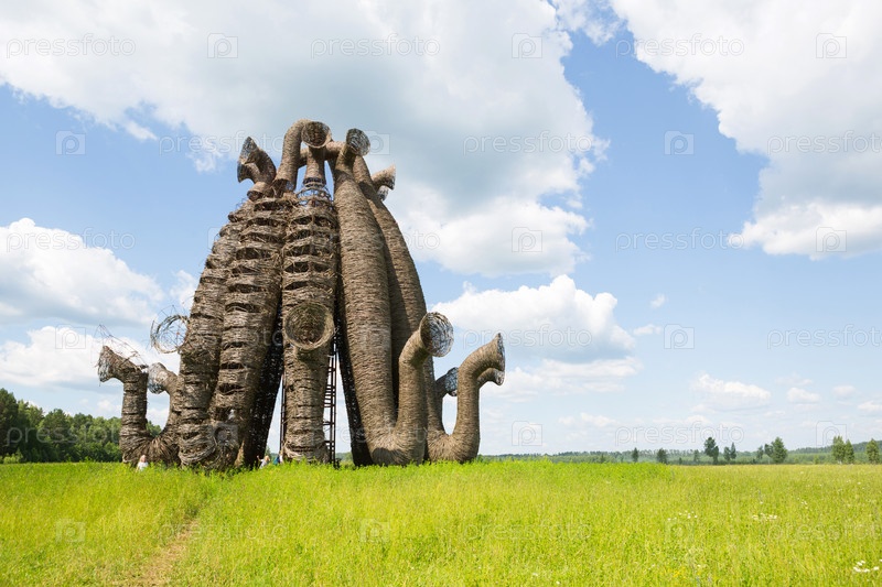 Россия, Калуга, 24 июня 2020 г. Фестиваль арт-объектов в Никола Ленивец Архстояние. Бобур. Креативная конструкция из природных материалов, веток, креативная архитектура
