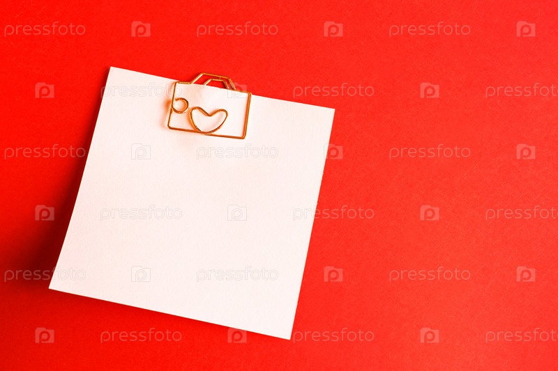 Квадратный лист для заметок со скрепкой в форме буквы и сердца. Декор влюбленных пар с сердечками на красном фоне. День святого Валентина, сообщение, приветствие, признание в любви. Копировать пространство