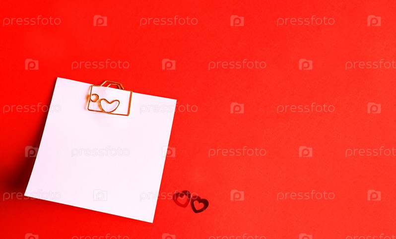 Квадратный лист для заметок со скрепкой в форме буквы и сердца. Декор влюбленных пар с сердечками на красном фоне. День святого Валентина, сообщение, приветствие, признание в любви