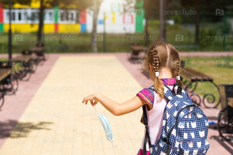 Девушка с рюкзаком возле школы после занятий со снятой медицинской маской, недовольная, уставшая. Коронавирусная инфекция, меры безопасности, меры предосторожности