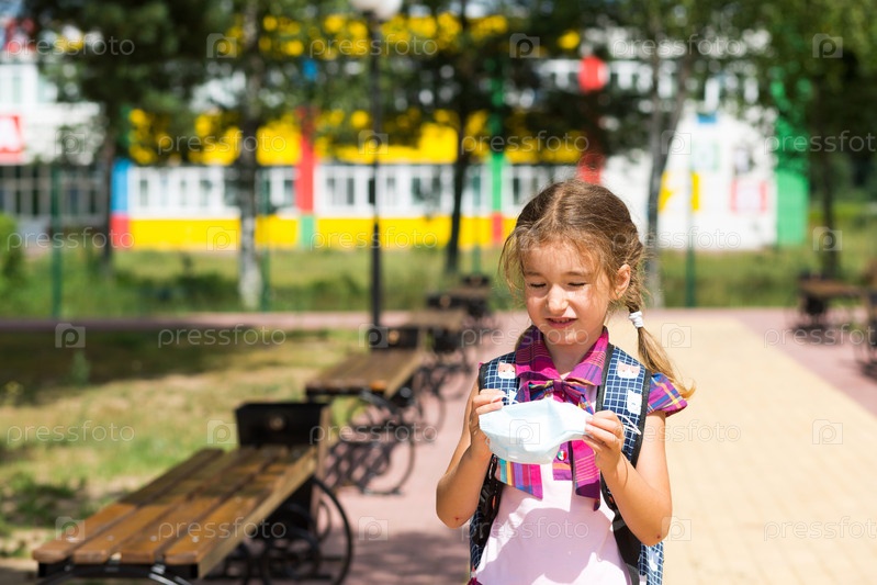 Девушка с рюкзаком возле школы после занятий снимает медицинскую маску, несчастная, усталая и с головной болью