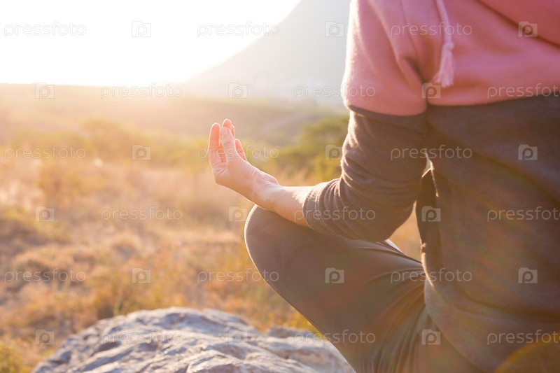Женщина сидит на камне в позе лотоса, сомкнув пальцы в знак гармонии, расслабления и медитации. Йога, самопогружение, баланс с природой. Горы, солнечный свет. копировать пространство