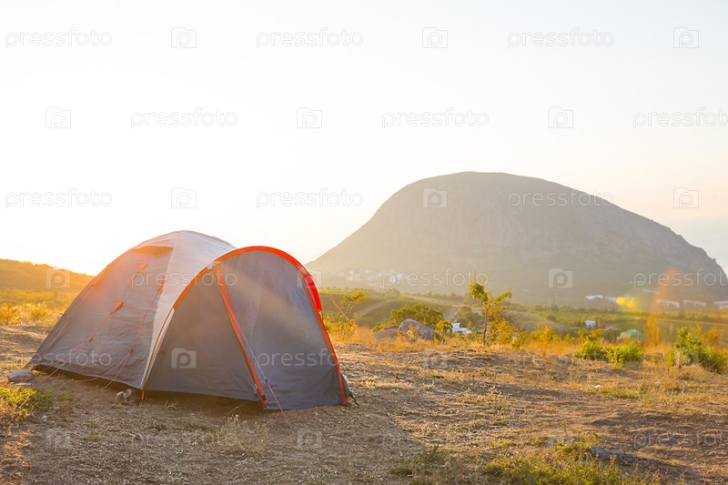 Установлена туристическая палатка в горах с видом на море и восход солнца. Внутренний туризм, активное летнее путешествие, семейные приключения. Экотуризм, кемпинг, спортивный горный туризм. Аю-Даг, Крым
