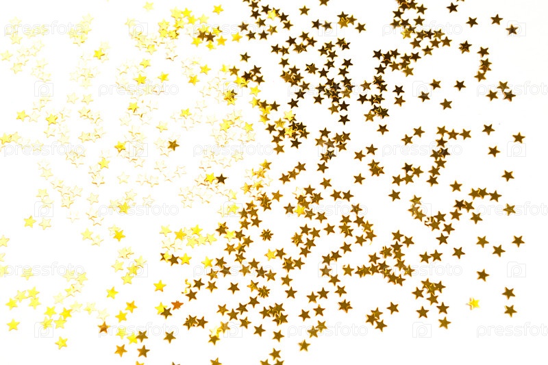 На белом фоне переливаются золотые блестки в виде звездочек. Фоны с копирайтом для праздника, украшения вечеринки, Рождества и Нового года, дня рождения и юбилея. Градиент и текстура
