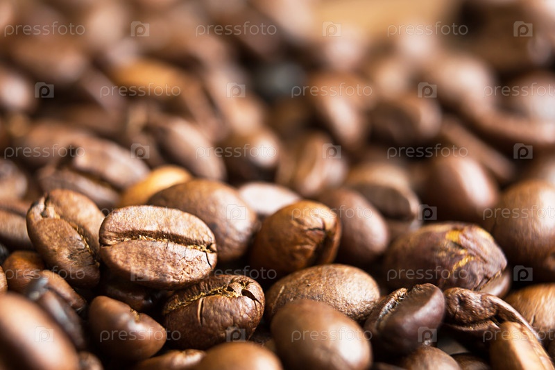 Жареные кофейные зерна крупным планом - ароматный фон. Коричневые кофейные зерна арабика разбросаны по деревянному столу. Копировать пространство